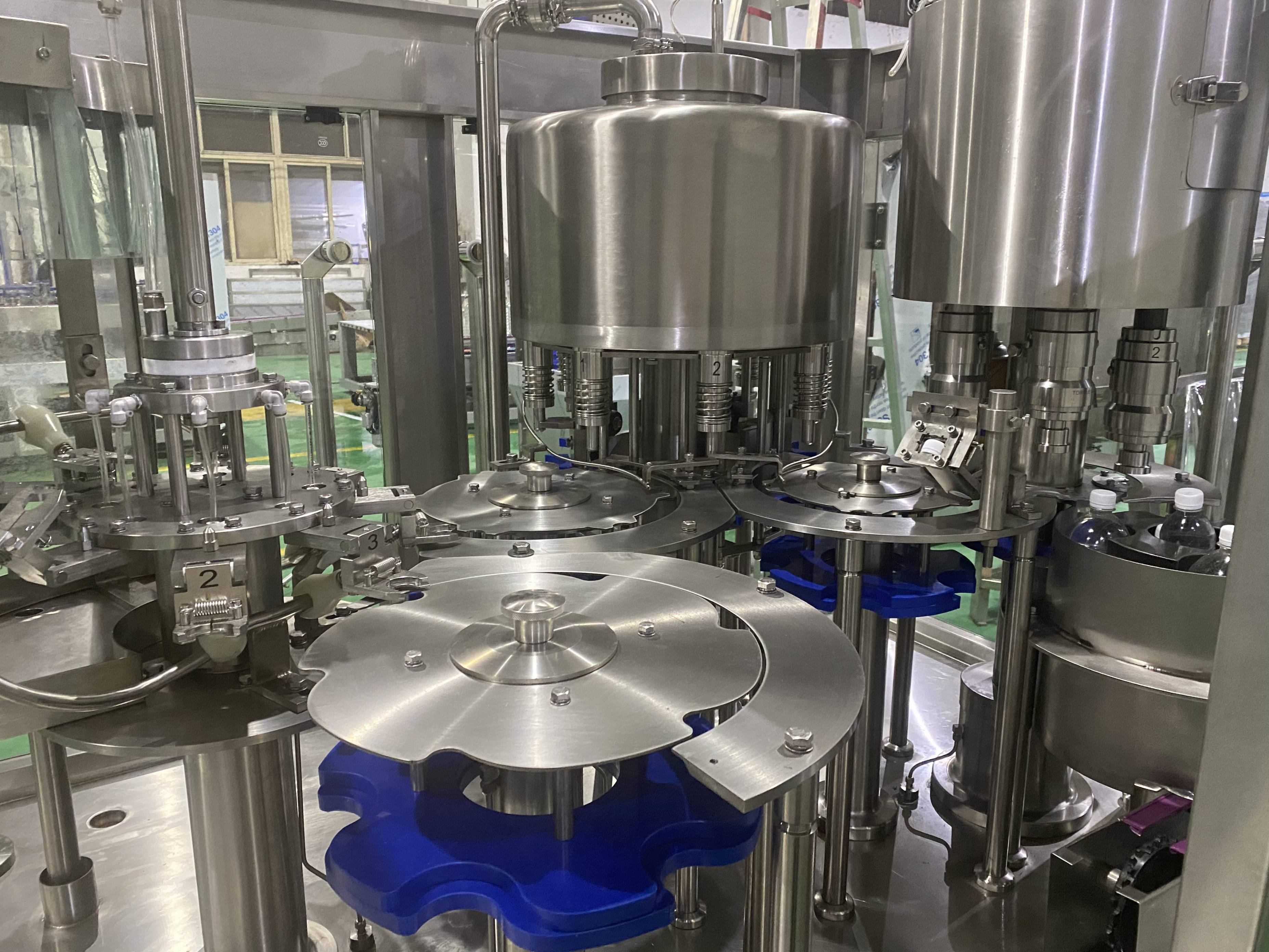 2、全过程实现自动化,适用于聚氨酯瓶、塑料瓶灌装果汁、矿泉水,加温控装置还可以进行热灌装。