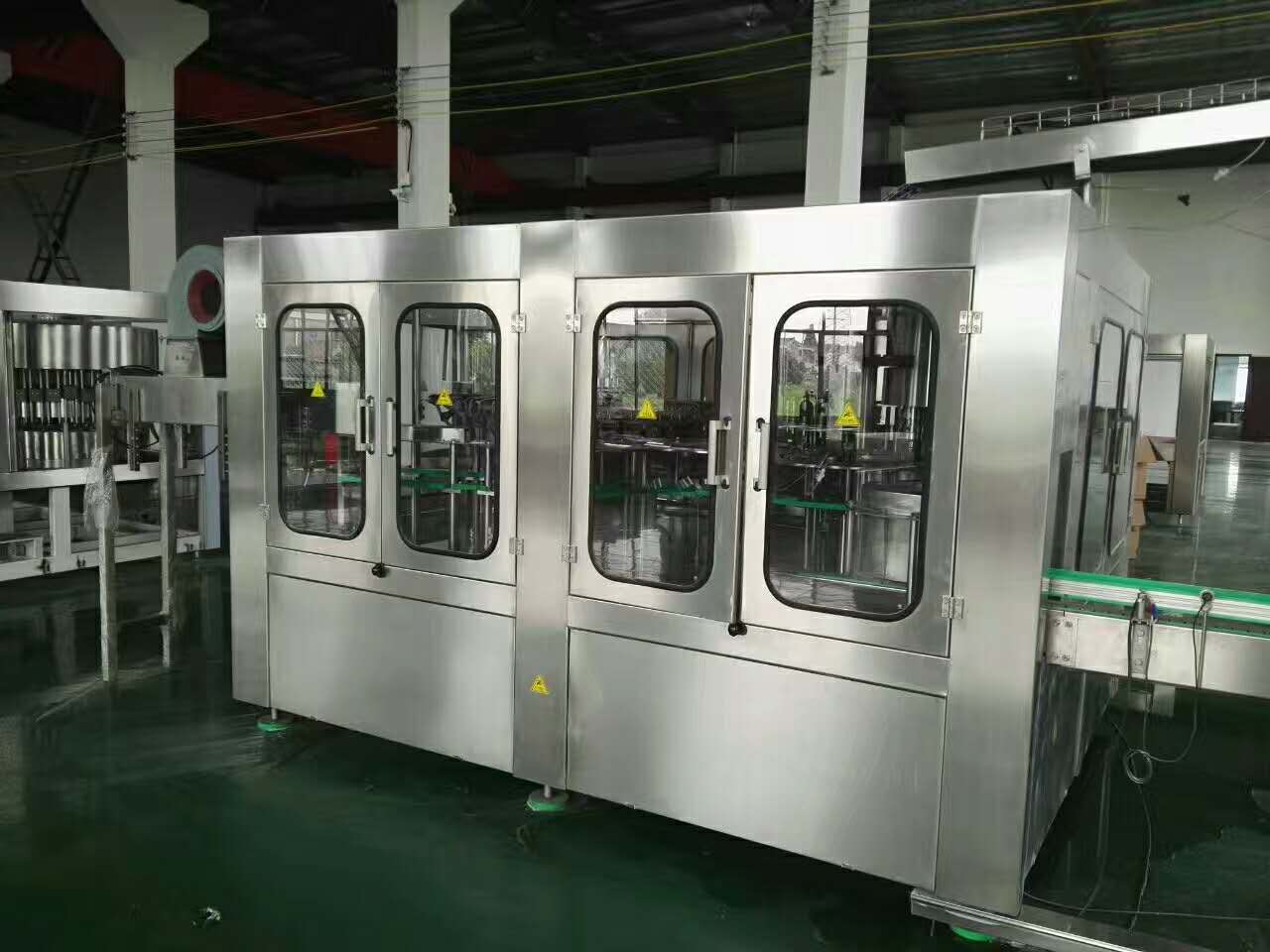 T型PET瓶洗瓶/灌装/封盖三合一机是我公司结合德国先进的灌装工艺合技术自主研制开发的专用于矿泉水、纯净水等不含汽饮料PET大瓶型的灌装的先进机型。该机采用瓶颈定位加托瓶底的输送方式,只需变换极少变更件即可适用于多种尺寸的瓶型,特别是对大瓶的输送更加平稳。灌装方式为微负压重力灌装,提高了灌装速度,能精确控制灌装液位。卫生级的循环管路为产品质量提供了可靠的保证。从法国引进的即抓即旋盖技术处于国内领先水平。