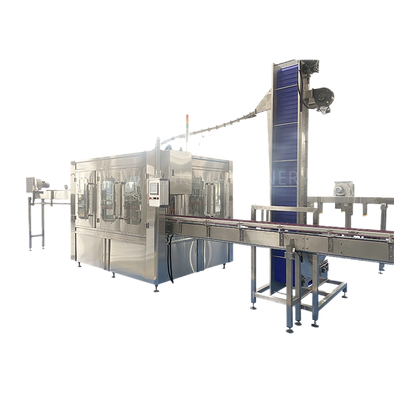 PET瓶洗瓶/灌装/封盖三合一机是我公司结合德国先进的灌装工艺合技术自主研制开发的专用于矿泉水、纯净水等灌装的先进机型。该机采用瓶颈定位加托瓶底的输送方式,只需变换极少变更件即可适用于多种尺寸的瓶型,特别是对大瓶的输送更加平稳。灌装方式为常压灌装,提高了灌装速度,能精确控制灌装液位。卫生级的循环管路为产品质量提供了可靠的保证。从法国引进的即抓即旋盖技术处于国内领先水平。